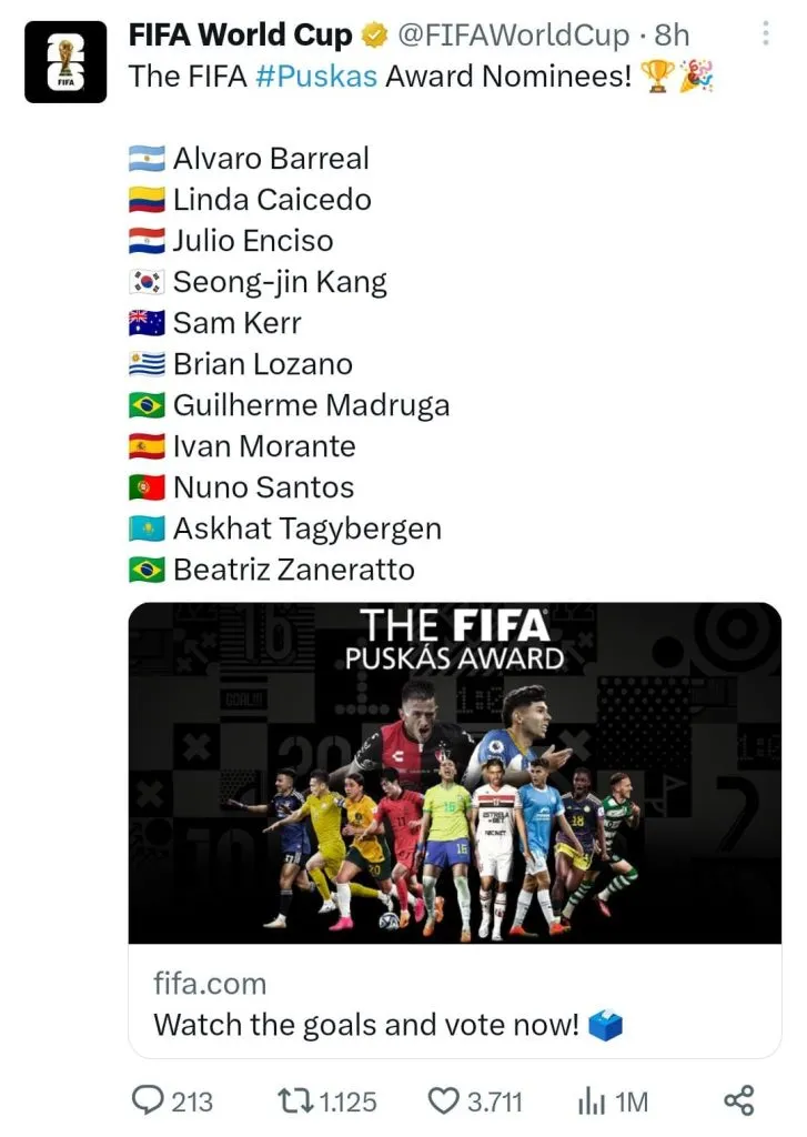 A FIFA anunciou na manhã desta sexta-feira (22), o nome dos 11 jogadores que foram autores dos gols mais memoráveis. O Brasil teve dois indicados ao prêmio Puskás, entre estes está a atacante da Seleção Brasileira e do Palmeiras Bia Zaneratto. Foi vestindo a camisa da equipe canarinho que a ofensiva conseguiu marcar um golaço que impressionou não apenas o torcedor como a entidade máxima do futebol mundial.