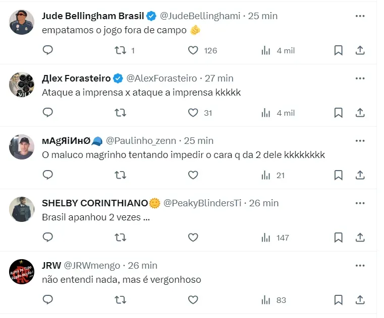 “Não sabe receber as pessoas na sua casa não? Você vai jogar lá no Brasil. Tem que ter respeito seu merd*”, concluiu. Alguns membros das duas comissões chegaram a ser agredirem, mas foram separados de forma imediata.