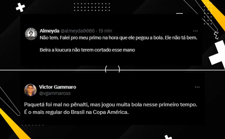 Teve também quem elogiou. “Paquetá foi mal no pênalti, mas jogou muita bola nesse primeiro tempo. É o mais regular do Brasil na Copa América”, destacou mais um internauta.