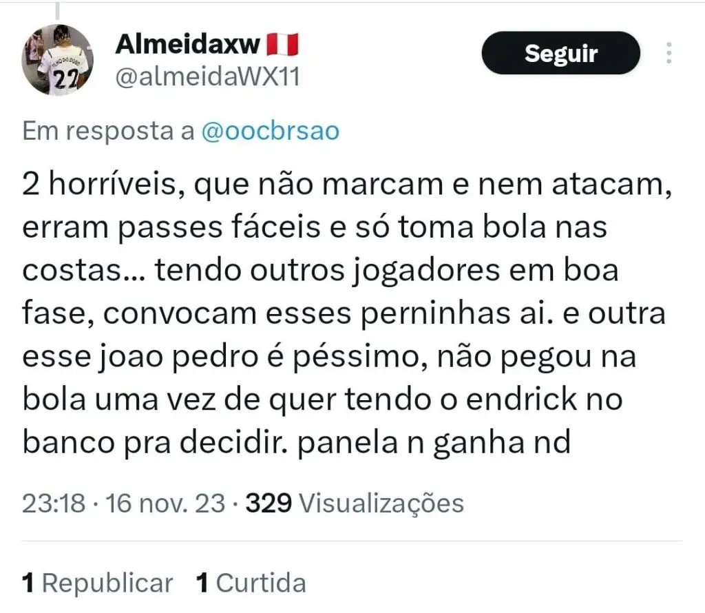 “É inadmissível o jogador horrível do Emerson Royal vestir a camisa da seleção. Outro que não devia ser mais convocado é o Renan Lodi. Além de ruim, foi ele quem ENTREGOU o título da Copa América para a Argentina em pleno Maracanã. Esses dois precisam sumir da seleção brasileira”, avaliou um internauta.