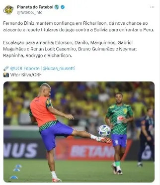 Segundo informação do UOL Esporte, Richarlison será escalado novamente entre os titulares da Seleção Brasileira no jogo contra Peru. Não somente ele, mas o restante da escalação que esteve em campo contra a Bolívia deve ser repetido no próximo duelo. Sendo assim, o Brasil deve enfrentar o adversário com: Ederson, Danilo, Marquinhos, Gabriel Magalhães e Renan Lodi; Casemiro, Bruno Guimarães e Neymar; Raphinha, Rodrygo e Richarlison.