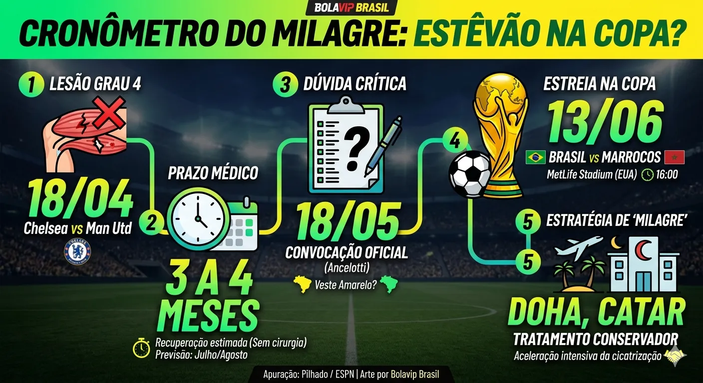 De acordo com apuração de Pilhado (Thiago Asmar), só um milagre para Estevão conseguir se recuperar a tempo do torneio de seleções e a notícia da sua lesão caiu como uma bomba na CBF.