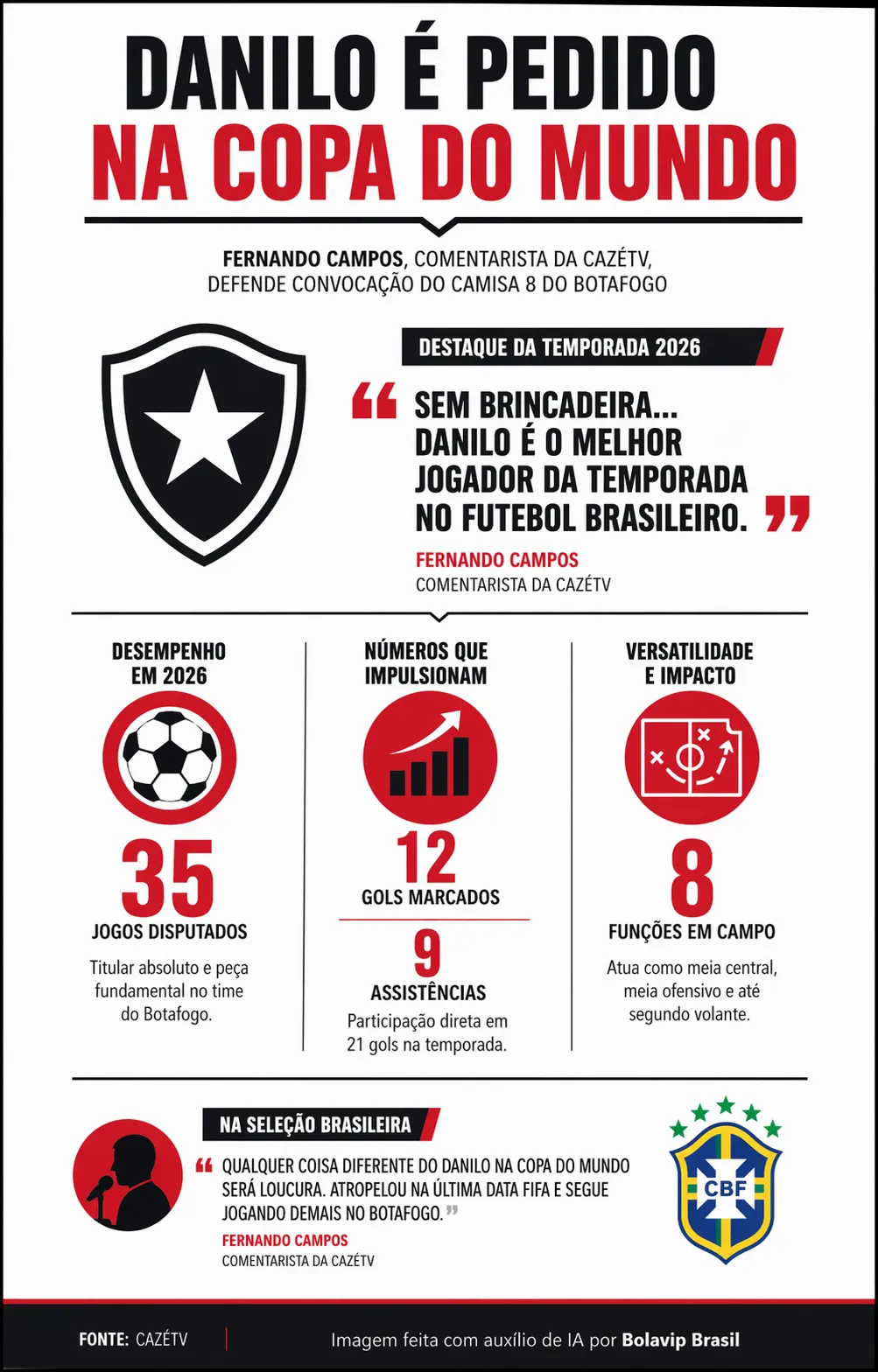 Muitos jogadores vêm se destacando na temporada de 2026 e seus nomes vem sendo pedido na Seleção Brasileira. Após decidir uma importante vitória para o Botafogo contra o Racing, da Argentina, fora de casa, pela Sul-Americana, Danilo foi muito elogiado pelo comentarista Fernando Campos.