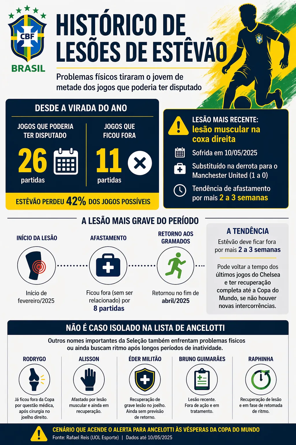 Não foi apenas uma substituição comum a saída de Estêvão na derrota por 1 a 0 do Chelsea para o Manchester United, no último sábado. A lesão muscular na coxa direita, embora não o tire, por ora, da Copa do Mundo, é o tipo de ocorrência que exige atenção e, no caso de Ancelotti e sua comissão técnica, apreensão.