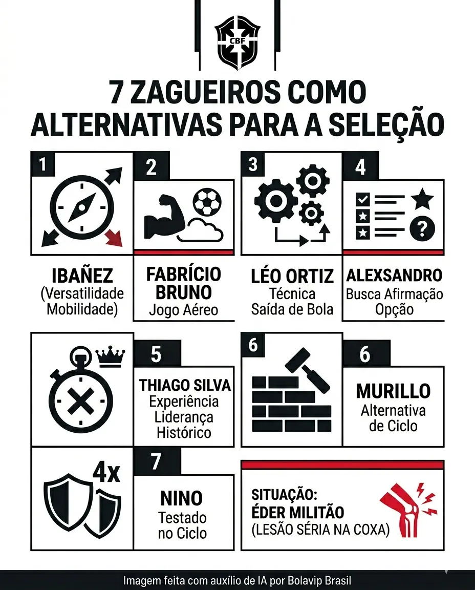 Nesse cenário, alguns nomes começam a ser considerados como alternativas para a zaga. Entre eles estão Ibañez, Fabrício Bruno, Léo Ortiz, Alexsandro e Thiago Silva, que surgem como possíveis substitutos caso Militão não se recupere a tempo do Mundial.