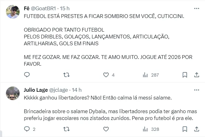 “Sou muito grato por isso, porque o carinho chegou a mim e a toda a seleção argentina, que sentíamos o desejo de toda essa gente querendo que fôssemos campeões. Sou grato também aos brasileiros, que me mandaram muito carinho”, concluiu Messi.