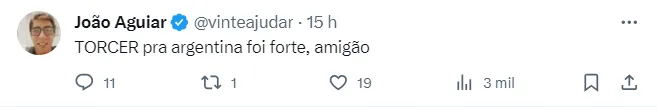 Messi foi sincero, e admitiu respondendo que não esperava a torcida dos brasileiros pelos Hermanos. “O que eu vi foi incrível. Eu sabia que as pessoas do Brasil tinham muito carinho, mas pra torcer para a Argentina, para sermos campeões do mundo, eu não esperava”.