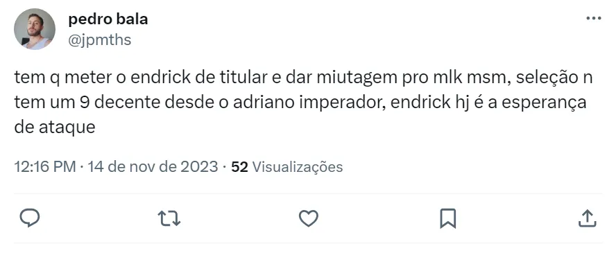 Apesar de Endrick estar pela primeira vez na Seleção principal, muitos torcedores pedem que o atacante seja escalado como titular e o jornalista Abel Neto, da ESPN, não vê nenhum absurdo caso isso aconteça.