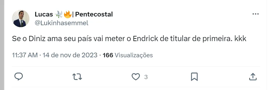 Aos 17 anos, o atacante Endrick foi chamado pela primeira vez para defender a Seleção Brasileira principal. O treinador Fernando Diniz convocou jovem jogador para os jogos das Eliminatórias da América do Sul, em novembro.