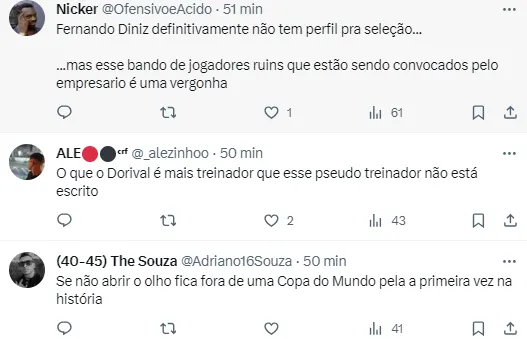 A torcida brasileira está “pistola” com esses dados e comenta nas redes sociais sobre o treinador: “Fernando Diniz definitivamente não tem perfil pra seleção”, outro comentou: “Se não abrir o olho fica fora de uma Copa do Mundo pela a primeira vez na história.”