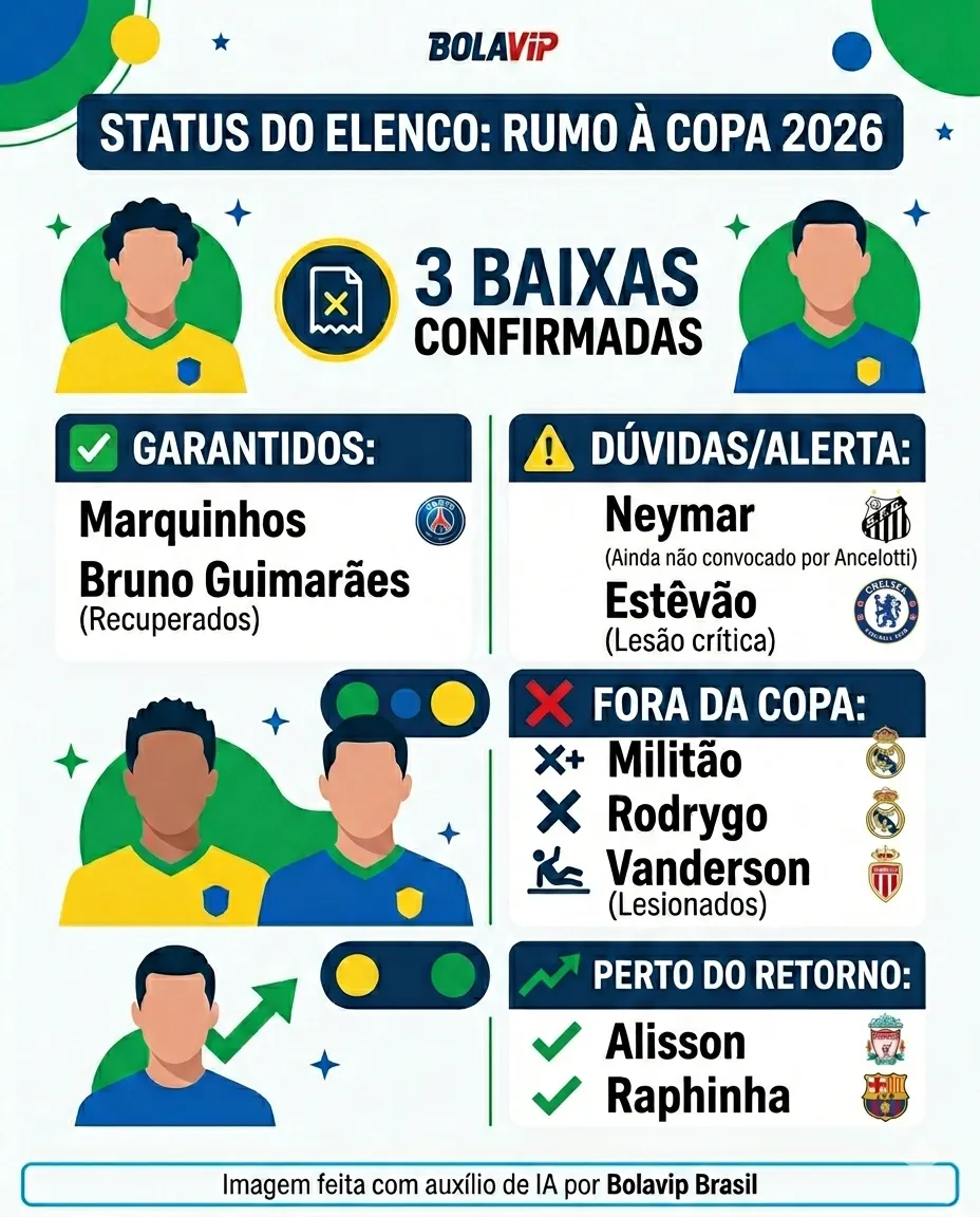 O site Blog do Torcedor do UOL, trouxe um levantamento com a lista da situação de jogadores que viviam a expectativa por serem convocados. A lista tem: Militão, Rodrygo, Vanderson, Estevão, Alisson, Raphinha, Neymar, Bruno Guimarães e Marquinhos.