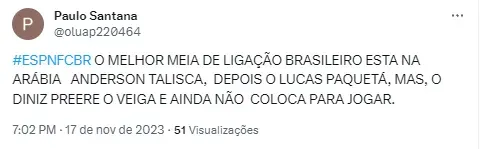 Um jogador citado nas redes sociais foi Anderson Talisca, que vive boa fase no Al-Nassr, time de Cristiano Ronaldo na Arábia Saudita. Outras opções estão mais viáveis para a CBF, já que foram chamadas para a equipe Sub-23 de Ramon Menezes.