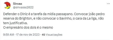 Tanto Savinho, do Girona, quanto Marcos Leonardo, do Santos, são vistos com bons olhos pelos torcedores na web. Ainda resta saber se Diniz vai mesmo utilizar o direito de chamar outro atleta ou vai apenas suprir a ausência de Vinícius Júnior com as peças já presentes.