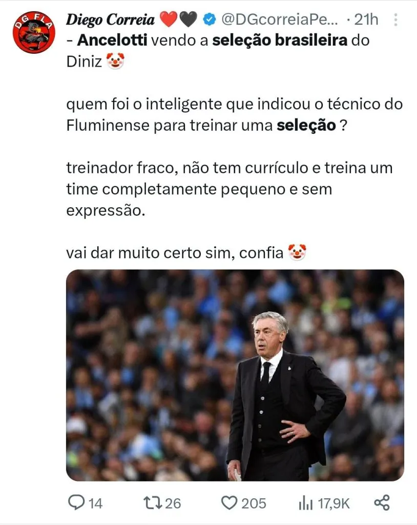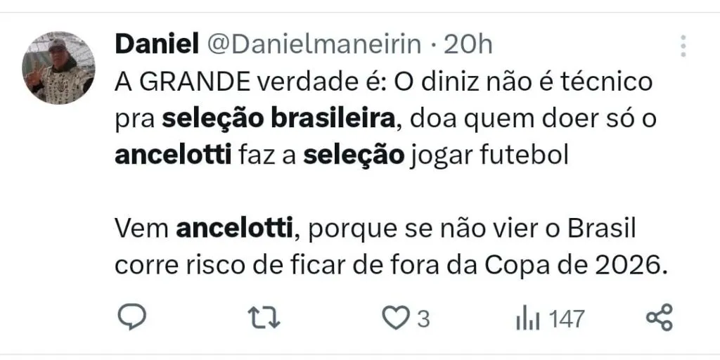 Por que arriscar uma história de sucesso com a chance de fracassar com uma seleção que está longe de ser aquela que um dia teve nomes como Pelé, Ronaldo, Cafú, Roberto Carlos e companhia? Atualmente a Seleção é apenas uma sombra do que foi um dia e precisa claramente de uma reformulação e mostra que não basta apenas uma mudança no comando, mas o protagonismo de novas peças. Sigo acreditando que Ancelotti ainda é a melhor opção, já conhece bem nomes que devem representar a nova fase da Seleção, como Vinicius Júnior e Rodrygo, mas o italiano não é nem de longe a garantia de uma solução. Sem contar que diante do caos que está, qualquer proposta para renovação com o Real Madrid deve fazer o treinador voltar atrás e dar adeus ao suposto acordo verbal que um dia fez com a CBF.