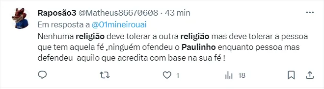 “A intolerância religiosa é crime e deve ser combatida por todos. O Galo repudia veementemente os ataques destinados ao nosso atleta Paulinho, nas redes sociais, durante a partida da Seleção Brasileira. Força, Paulinho. Que sua fé te proteja da maldade alheia!”, destacou o post do Galo.