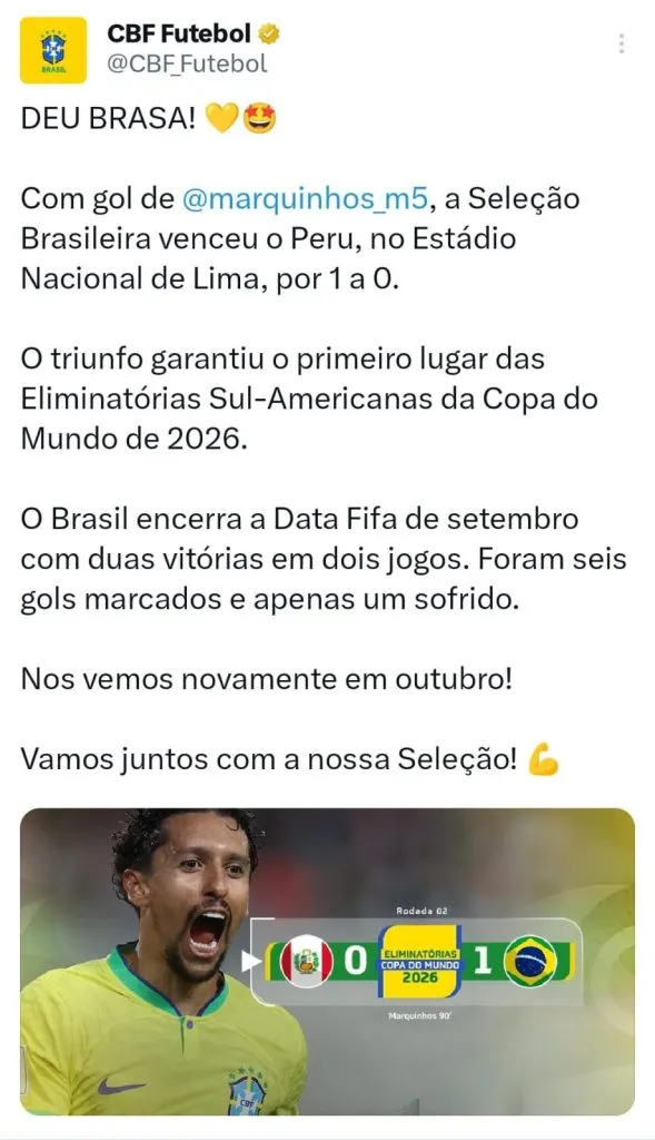 Após o início vitorioso, a Seleção volta a jogar no próximo mês quando o time terá mais dois confrontos pelas Eliminatórias. Fernando Diniz comandará a equipe canarinho em um duelo diante da Venezuela, em Cuiabá, no dia 12 de outubro. Cinco dias após, o desafio será contra o Uruguai, em Montevidéu.