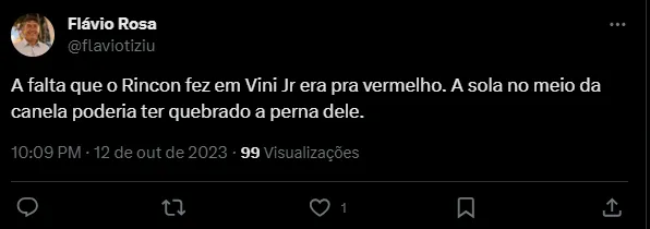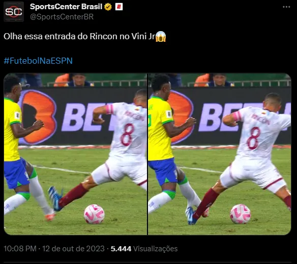 “A falta que o Rincon fez em Vini Jr era pra vermelho. A sola no meio da canela poderia ter quebrado a perna dele”, “Olha a entrada desse Rincon no Vini Jr. É Fagner venezuelano”, ‘Rincon quase arrancou o meião do nosso Vini Jr” e “Caraca o cara cravou a chuteira no Vini”, foram alguns dos comentários dos brasileiros, que ficaram impressionados com o lance.