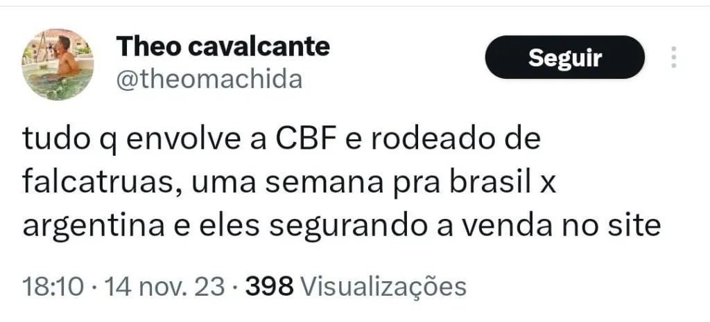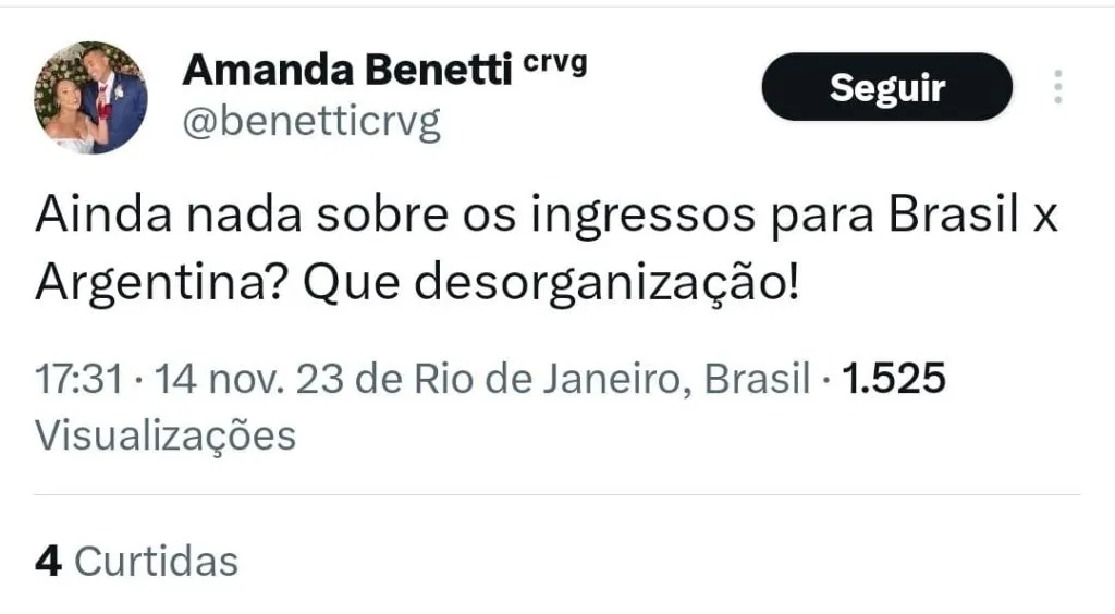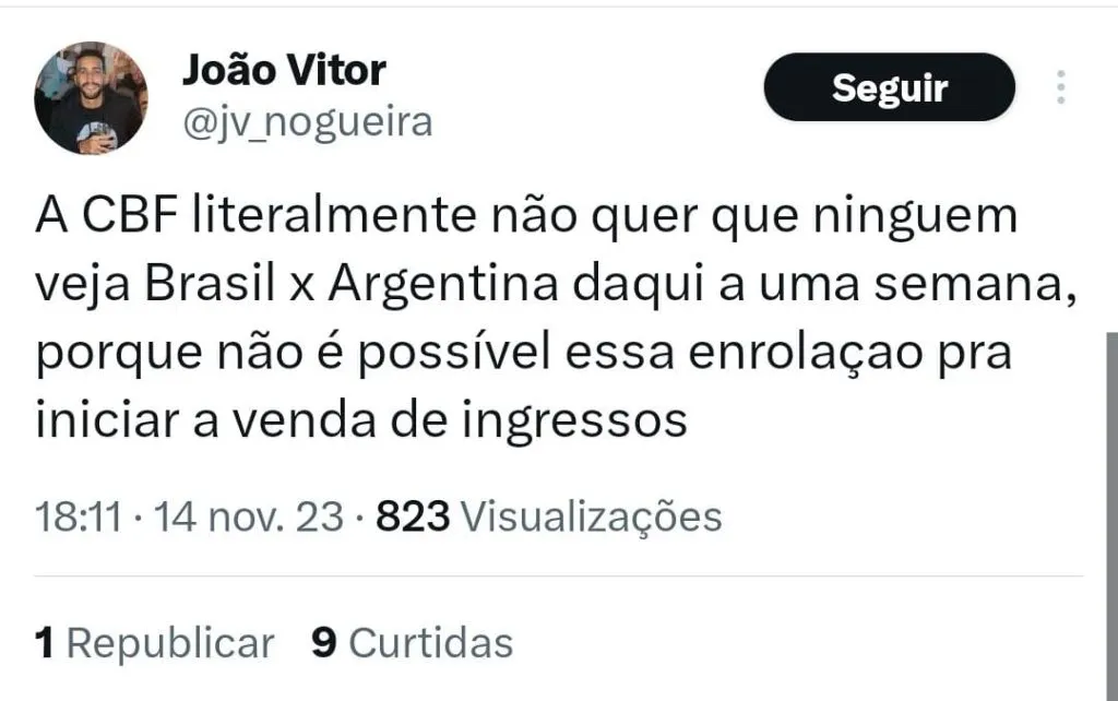 “E a venda de ingressos para Brasil x Argentina nunca abriu, né….. Qual a dificuldade da CBF soltar um comunicado oficial com as devidas informações? Já tô até vendo o perrengue que vai ser para conseguir ingresso….”, questionou uma torcedora.