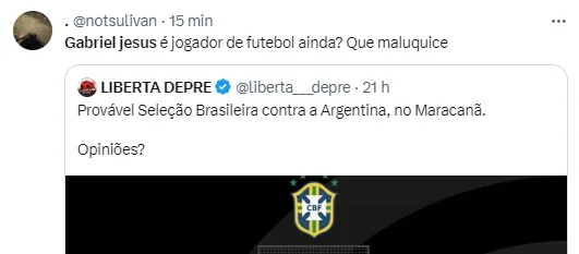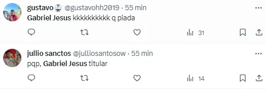 “Gabriel Jesus é jogador de futebol ainda? Que maluquice”, foi um comentário que aparaceu depois da provável escalação da Seleção Brasileira. “Gabriel Jesus kkkkkkkkkk q piada”, comentou outro torcedor.