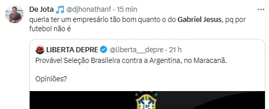 Vini Jr. saiu machucado no duelo contra a Colômbia, e será desfalque contra a Argentina. Por isso, Gabriel Jesus deverá ser titular, o que não agradou à torcida. “Queria ter um empresário tão bom quanto o do Gabriel Jesus, porque por futebol não é”, comentou um torcedor nas redes sociais.