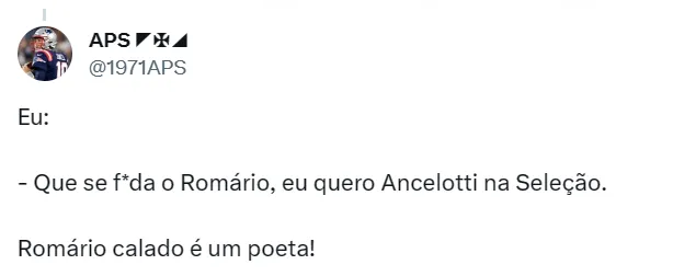 Por falar em Ancelotti, os rumores de que o treinador italiano assumirá a Seleção Brasileira a partir do ano que vem ainda rende muito assunto. Desta vez, foi Romário quem deu seu pitaco sobre o tema.