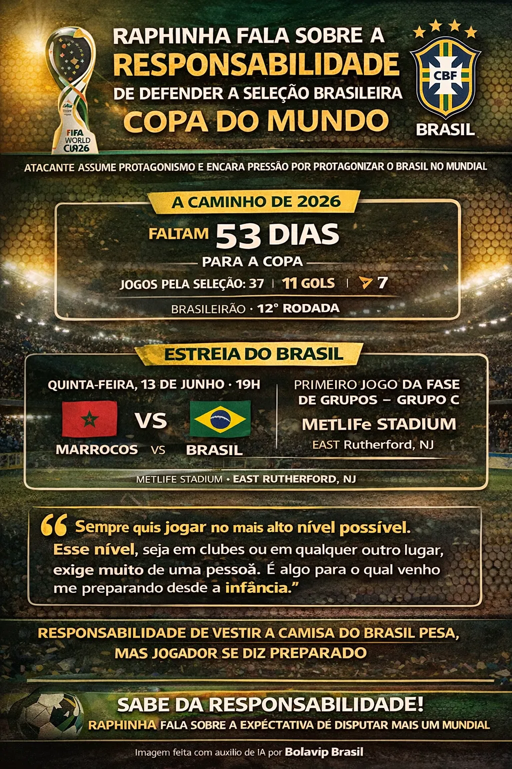 Uma das esperanças de o Brasil conquistar o tão sonhado “hexa” está nos pés do atacante Raphinha, um dos destaques do Barcelona (Espanha) e que, só por uma catástrofe, não estará no Mundial. O atleta sabe da pressão e da expectativa de disputar uma Copa com a camisa mais vencedora do futebol mundial, mas disse que está preparado para isso.