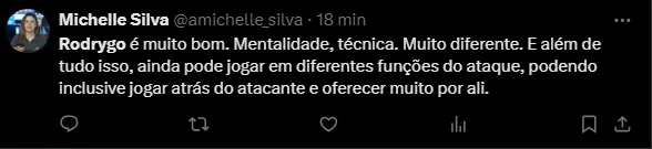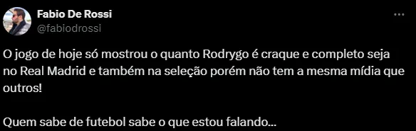 Rodrygo mais linear? A copa mostrou isso”, “O jogo de hoje só mostrou o quanto Rodrygo é craque e completo seja no Real Madrid e também na Seleção” “Rodrygo é muito bom. Mentalidade, técnica. Muito diferente”, foram alguns comentários.