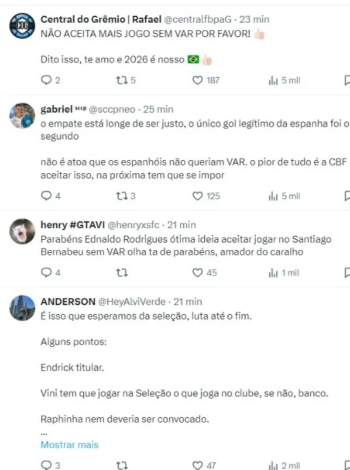 As duas penalidades, claro, deixaram os brasileiros revoltados com a inesistência do lance. “Nunca vi um assalto desse nível contra a seleção brasileira Que vergonha essa arbitragem!“, escreveu um torcedor no X, antigo Twitter.