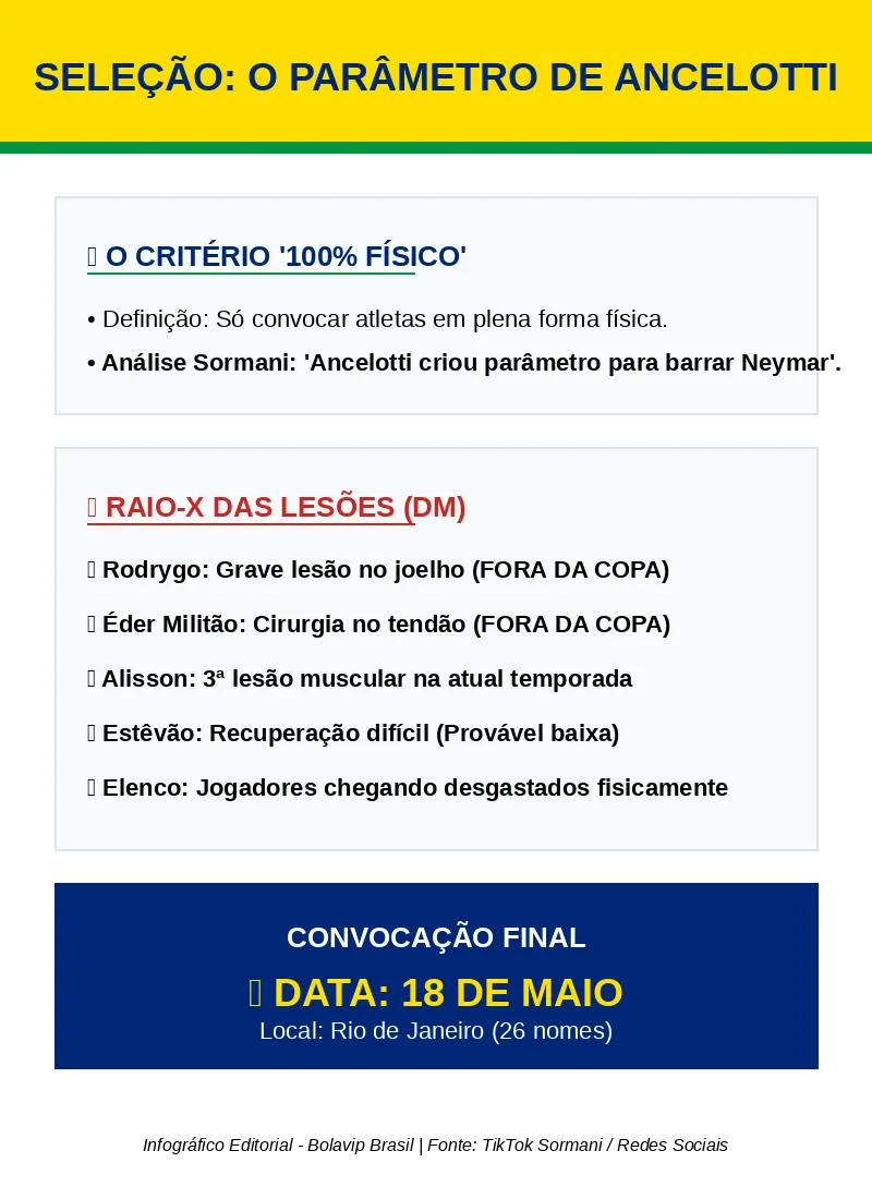 Com tantos problemas por lesões para convocar o Brasil para o Mundial, Ancelotti ainda mantém dúvidas na relação dos 26 nomes. O técnico italiano anuncia no dia 18 de maio, no Rio de Janeiro, a lista final.