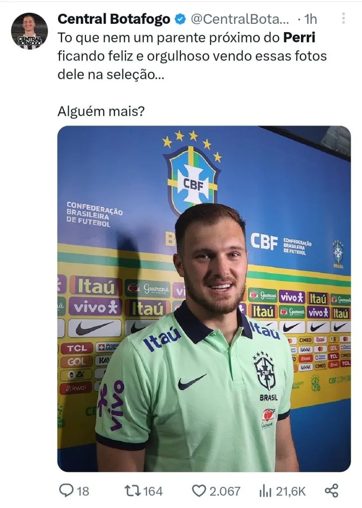O goleiro Lucas Perri começou as atividades pela Seleção Brasileira. O atleta que atuou na última rodada da Série A do Campeonato Brasileiro, se apresentou de madrugada em Belém (PA). Nesta segunda-feira (4) Perri fez um treino regenerativo no Mangueirão. É a primeira vez que o destaque do Botafogo no Brasileirão veste a camisa amarelinha. O goleiro não escondeu a emoção e disse estar realizando um sonho.