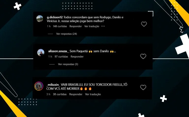“Sem Vini, Paquetá e Danilo, o Brasil virou uma nova seleção”; “Sem Vini, Paqueta, Danilo e Alisson, entendeu seu Dorival ????”, comentaram nas redes. Outros foram ainda mais incisivos, afirmando que a equipe jogou 1.000% melhor com as mudanças.