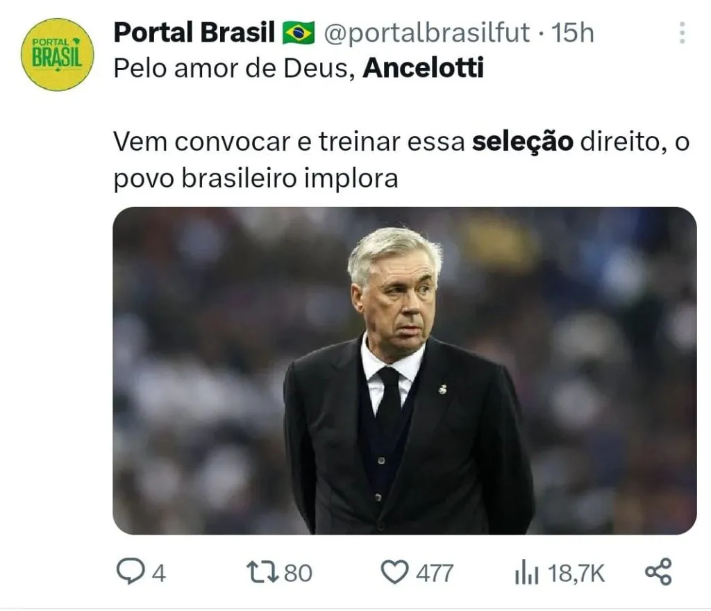 Além dele, Rodrigo Mattos também vê Ancelotti como a melhor saída para a Seleção