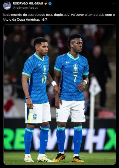 De acordo com a CBF, Endrick, que está em sua terceira convocação, já terá a responsabilidade de vestir a camisa 9. Já Rodrygo seguirá com a lendária camisa 10 na ausência de Neymar.