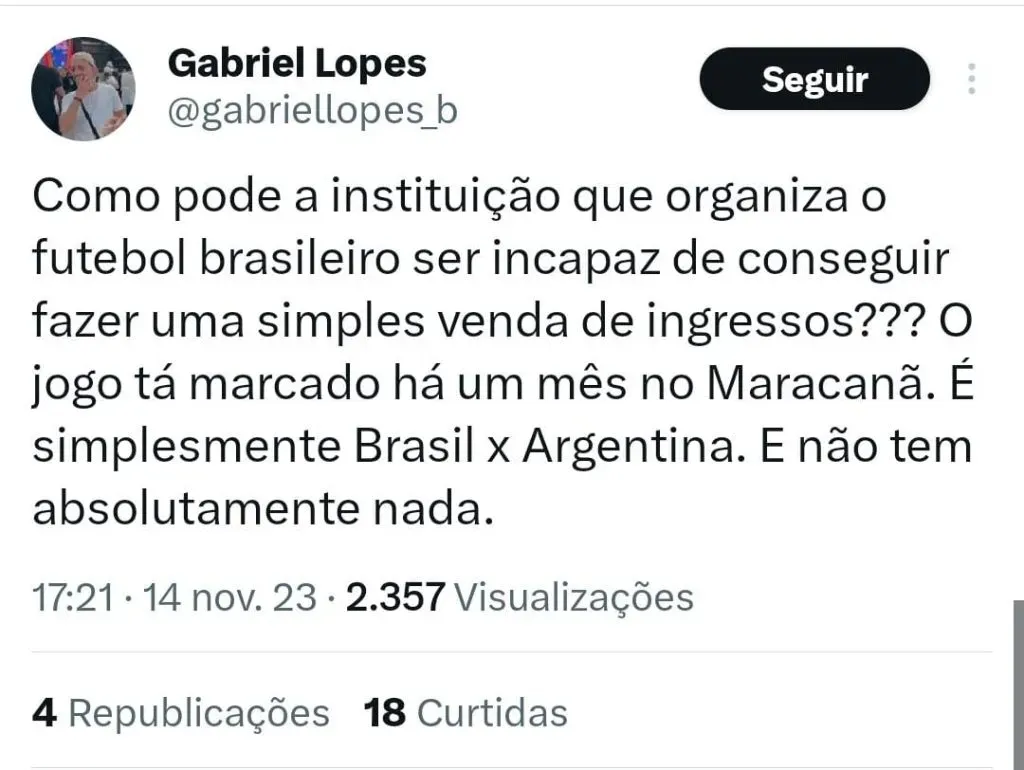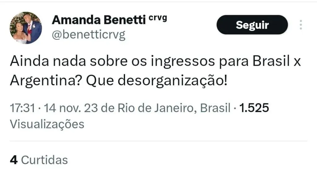 “E a venda de ingressos para Brasil x Argentina nunca abriu, né….. Qual a dificuldade da CBF soltar um comunicado oficial com as devidas informações? Já tô até vendo o perrengue que vai ser para conseguir ingresso….”, questionou uma torcedora.