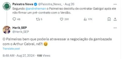 Sabendo disso, os torcedores palmeirenses encheram as redes sociais de mensagens dizendo que Leila Pereira deveria dar um chapéu no Corinthians e anunciar a contratação de Arthur Cabral, do Benfica.