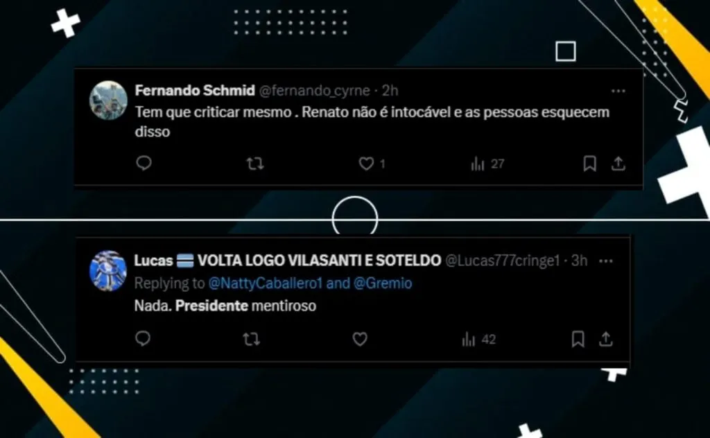 “Eu tenho falado para eles que, nos últimos jogos, tenho vergonha de chegar no hotel. Eu tenho vergonha na cara. O que eu falei para eles hoje, alguns, não são todos, alguns também precisam ter vergonha na cara. Eles têm que saber o tamanho do Grêmio, onde estão. Eles têm tudo, não falta absolutamente nada. Agora, tem que ter entrega dentro de campo”, completou Renato.