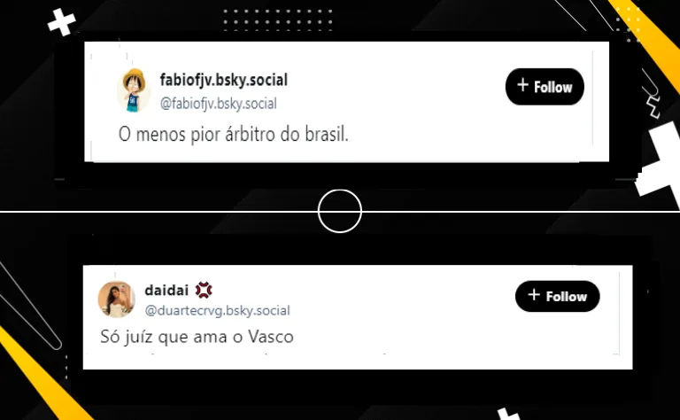 Por fim, alguns usuários da rede social até já previram coisas ruins na partida, com Raphael Claus: “Perdemos!”, afirmou um após a notícia. Já outra usou da ironia: “Só juiz que ama o Vasco”, avaliou.