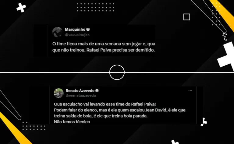 “O time ficou mais de uma semana sem jogar e, quando voltou, parece que não treinou. Rafael Paiva precisa ser demitido”. “Rafael Paiva tem que ser demitido pra ontem nunca vi um time desse 0% de sangue”, pediram torcedores vascaínos.