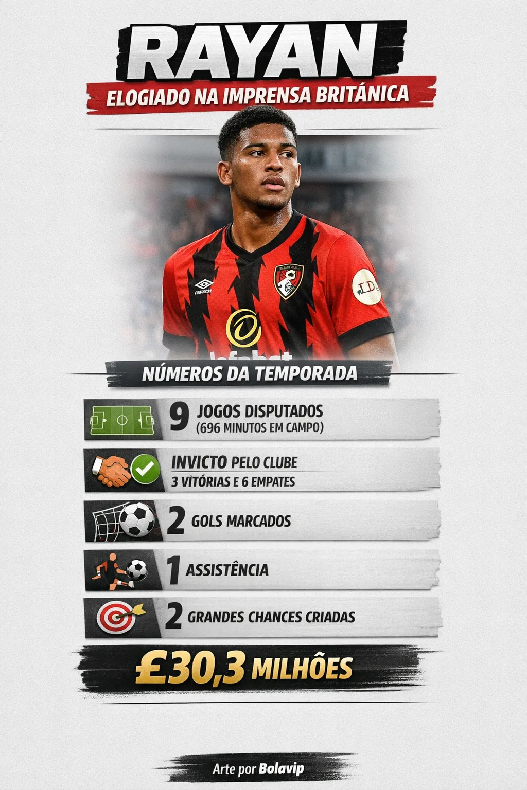 Contratado pelo Bournemouth em janeiro deste ano, Rayan rapidamente conquistou a torcida e a imprensa local. Mesmo com o desafio de assumir o lugar de Antoine Semenyo, a jovem promessa demonstrou rápida adaptação ao futebol europeu.