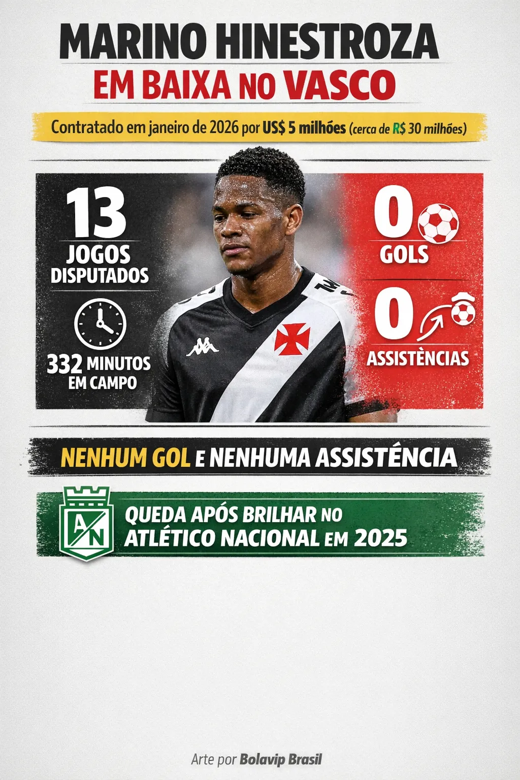 Aposta do Vasco para a temporada, Marino Hinestroza ainda não conseguiu se firmar em São Januário. Contratado na última janela de transferências junto ao Atlético Nacional, o atacante viu seus números caírem de forma significativa neste ano.