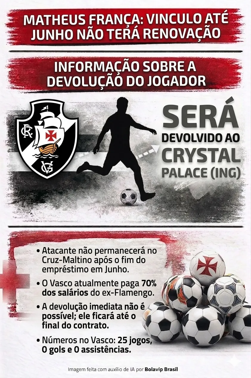O Vasco não vai se movimentar pra manter o Matheus França, o Matheus França será devolvido ao Crystal Palace em junho. “Por que não devolve agora?”, porque a janela de transferências está fechada, nem se o Vasco quisesse, nem se o Crystal Palace quisesse a transferência poderia acontecer”, revelou.