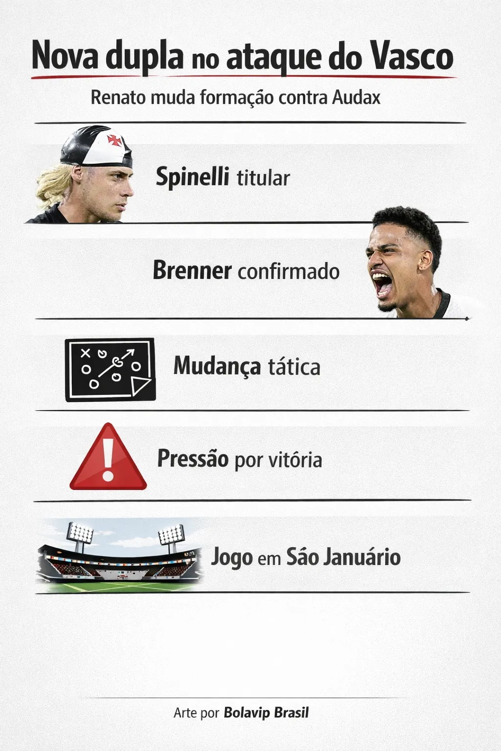 Segundo exposto por Bruno Murito, Renato irá utilizar a formação do Vasco com Cláudio Spinelli e Brenner, algo que não é comum de se ver neste elenco do Gigante da Colina.