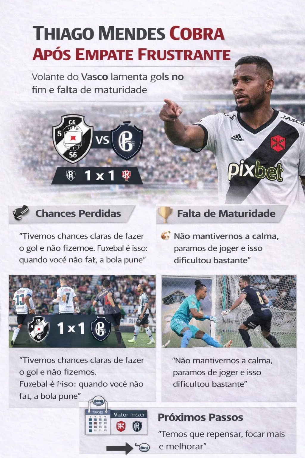 Thiago Mendes reforçou a necessidade de maior foco durante todo o jogo, incluindo os acréscimos, além de evolução em fundamentos como bola parada. O empate teve consequência direta na classificação. O Vasco chegou aos 13 pontos e segue distante do G-6, ocupando posição intermediária na tabela.