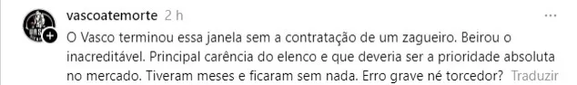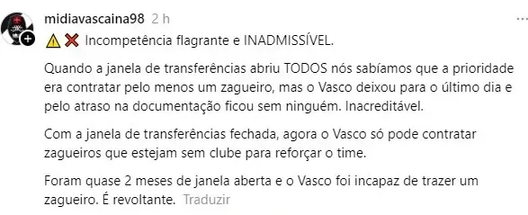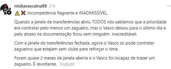 “Incompetência flagrante e INADMISSÍVEL. Quando a janela de transferências abriu TODOS nós sabíamos que a prioridade era contratar pelo menos um zagueiro, mas o Vasco deixou para o último dia e pelo atraso na documentação ficou sem ninguém. Inacreditável. Com a janela de transferências fechada, agora o Vasco só pode contratar zagueiros que estejam sem clube para reforçar o time. Foram quase 2 meses de janela aberta e o Vasco foi incapaz de trazer um zagueiro. É revoltante.”