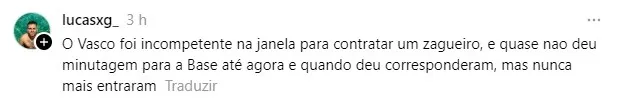 “O Vasco terminou essa janela sem a contratação de um zagueiro. Beirou o inacreditável. Principal carência do elenco e que deveria ser a prioridade absoluta no mercado. Tiveram meses e ficaram sem nada. Erro grave né torcedor?”
