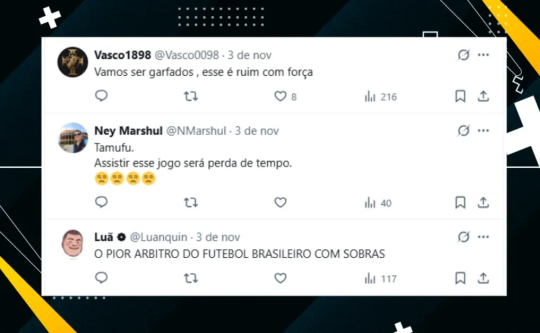 Dito isso, por mais que já seja uma figura conhecida e com bastante rodagem, Bruno Arleu chega pressionado para o jogo desta noite (5). Veja os comentários de alguns vascaínos sobre o tema: